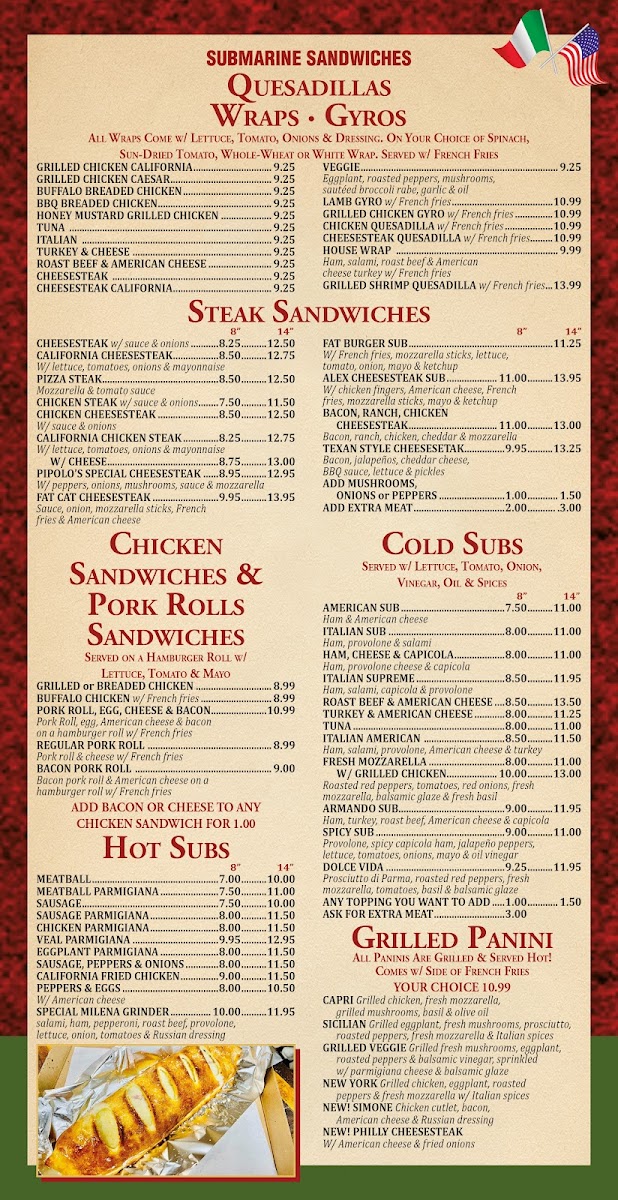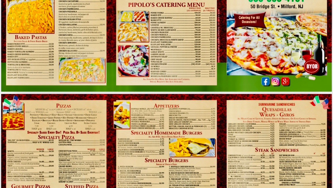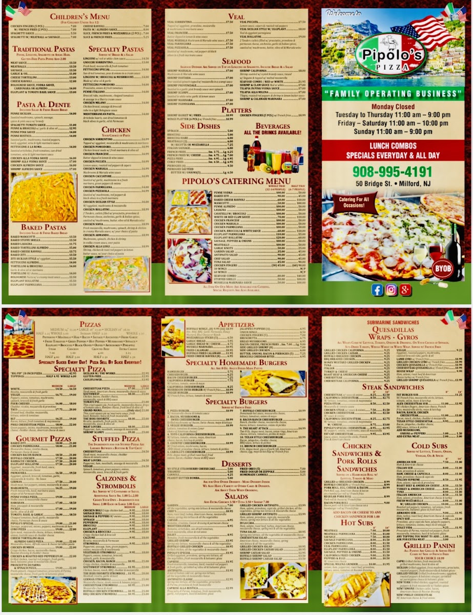 Pipolo’s Pizza at 50 Bridge St, Milford, NJ offers a menu that truly reflects variety, creativity, and comfort. Whether you’re craving hearty subs, gourmet pizza, or classic Italian favorites, this spot delivers something for every palate. Among their Steak Subs, the California Cheesesteak Sub and Pipolo's Cheesesteak Sub are standout options for meat lovers. Their Specialty Garlic Knots, such as the Chicken Parm Garlic Knots and Italian Garlic Knots, are unique and flavorful twists on a familiar favorite.