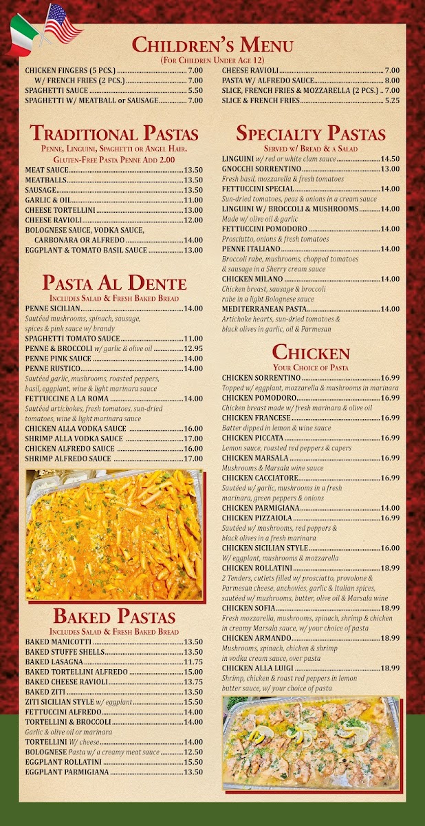 The menu also features hearty Platters (e.g., Shrimp Basket With Fries), comforting Homemade Soups, and satisfying Baked Pastas like Eggplant Rollatini Pasta. For something sweet, don’t miss the Fried Oreo or classic Tiramisu. Finally, their Catering Menu covers essentials like Chicken Parmigiana Catering and Penne Vodka Catering, ideal for events.